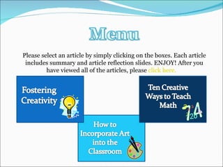 The document discusses several articles on fostering creativity in the classroom. It provides tips for teachers such as emphasizing process over product, accepting unusual ideas from students, and using art to allow students to explore creativity. The document also discusses how to incorporate art into the classroom through hands-on projects and field trips. Additionally, it outlines creative ways to teach math, such as using dramatization and storytelling.