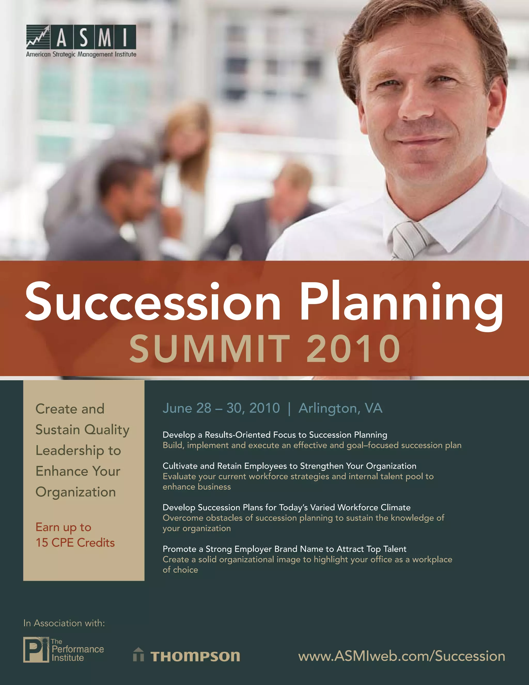 The document provides information about an upcoming succession planning summit to be held from June 28-30, 2010 in Arlington, VA. The summit will focus on developing effective succession plans, cultivating and retaining employees, overcoming obstacles to succession planning, and promoting a strong employer brand. It includes an agenda for the three-day event with sessions on creating results-driven succession plans, using social media to strengthen plans, retaining top talent, and developing a strong employer brand. The summit aims to help participants enhance their organizations by aligning succession plans with goals and engaging employees in the process.
