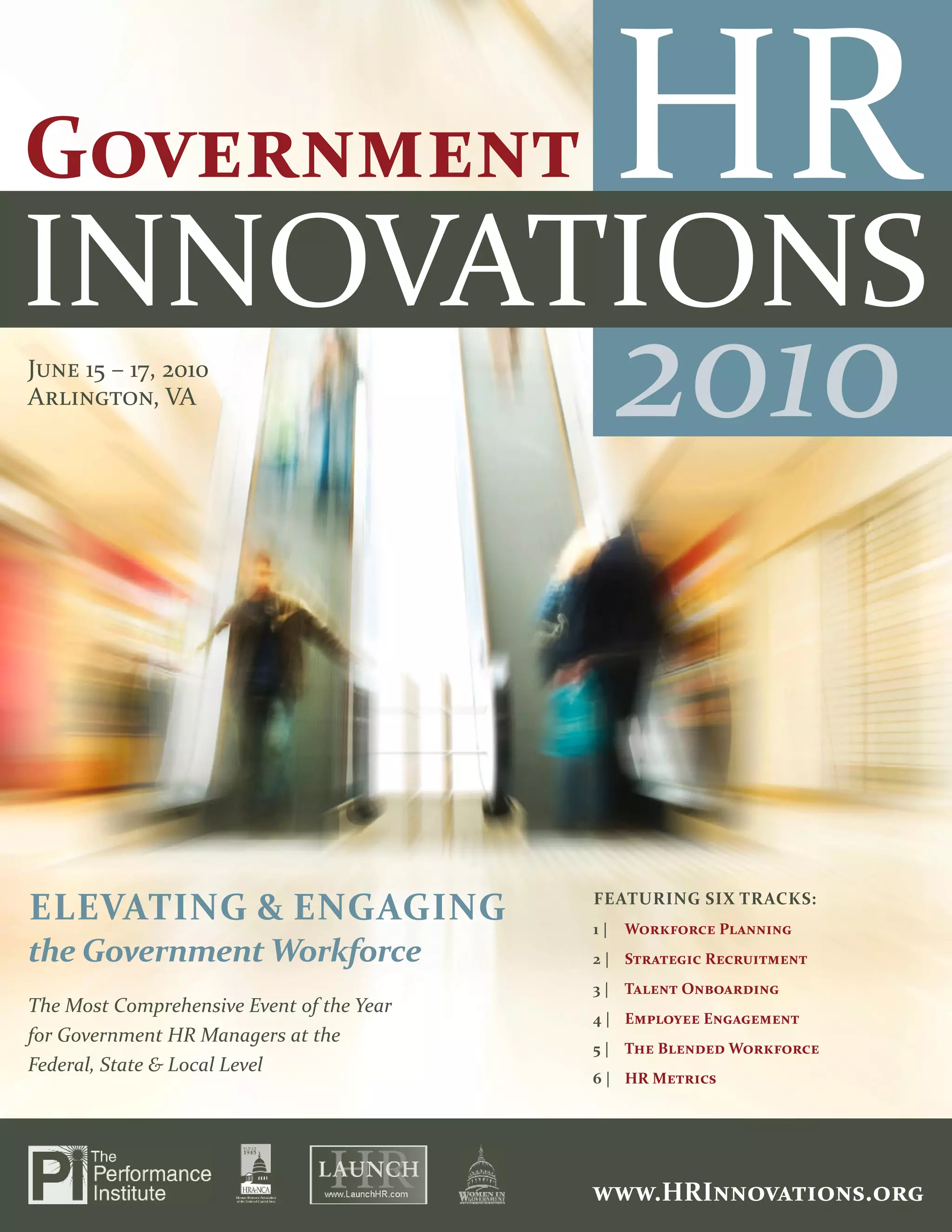 This document provides an agenda for the 2010 Government HR Innovations conference taking place June 15-17 in Arlington, VA. The conference features six tracks: 1) workforce planning, 2) strategic recruitment, 3) talent onboarding, 4) employee engagement, 5) the blended workforce, and 6) HR metrics. Day one includes keynote addresses and sessions within tracks A and B. Day two includes sessions within tracks C through F. Day three includes workshops on succession planning and leadership development programs. The conference aims to provide HR managers at the federal, state, and local levels with the most comprehensive event of the year to address key HR issues.