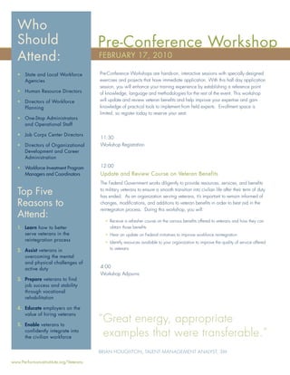 This document provides information about a conference on veteran reintegration into the civilian workforce held from February 17-19, 2010 in Arlington, VA. The conference aimed to help attendees develop skills and strategies to assist veterans transitioning from military to civilian life, including developing job training programs, creating strategic reintegration plans, and assisting disabled veterans with employment. Sessions covered topics such as utilizing one-stop career centers, retaining veterans in the workforce, and understanding programs to aid veteran reintegration.