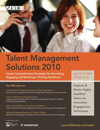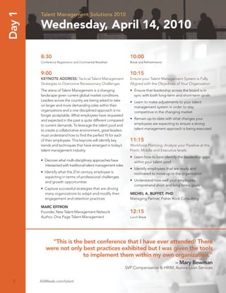 This document provides information about the Talent Management Solutions 2010 conference, including the schedule, speakers, and topics. The two-day conference will be held on April 14-15, 2010 in Arlington, VA and will focus on strategies for recruiting, engaging, and retaining employees. Topics will include talent management best practices, social media strategies, onboarding programs, employee retention, and succession planning. Speakers will provide case studies and techniques for communication, branding, and leadership development.
