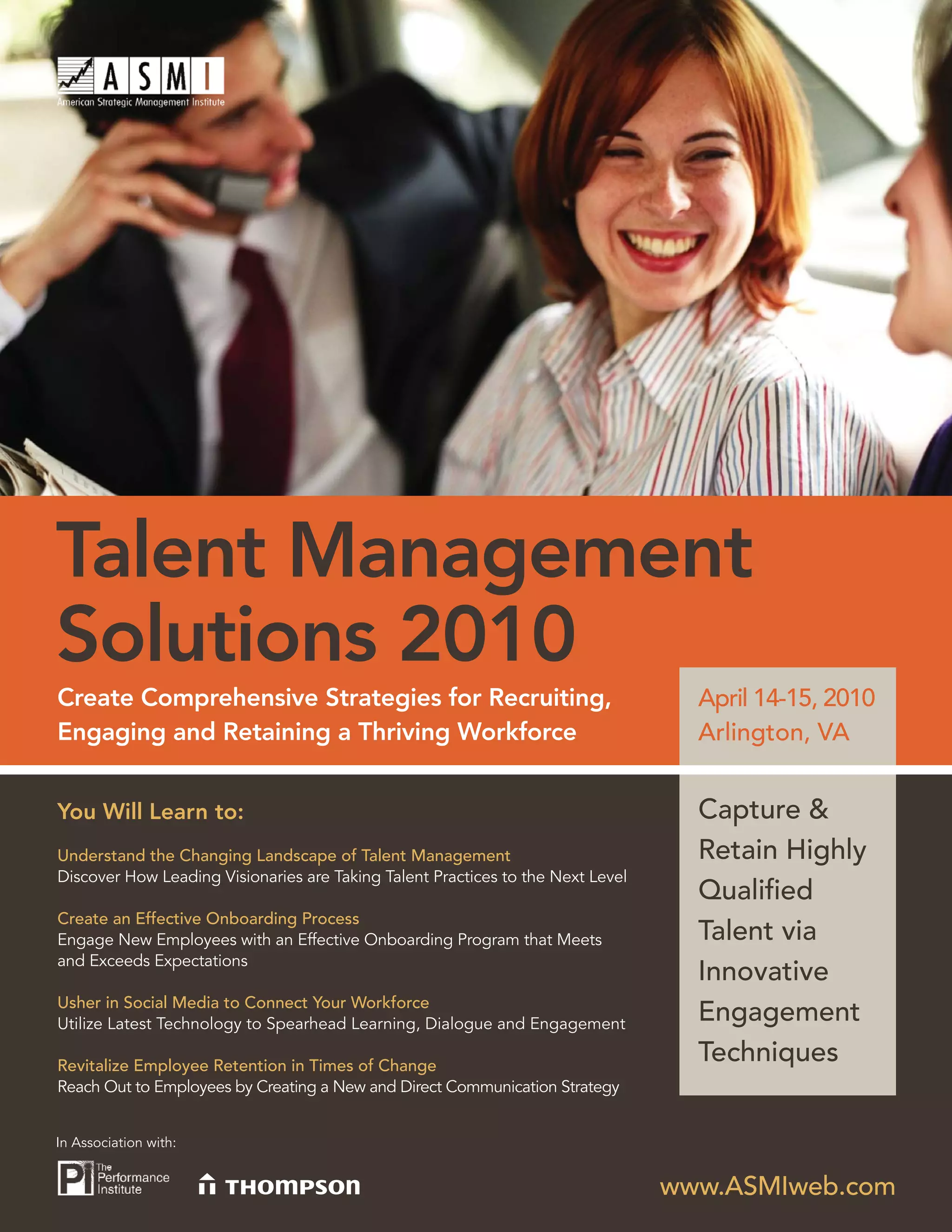 This document provides information about the Talent Management Solutions 2010 conference, including the schedule, speakers, and topics. The two-day conference will be held on April 14-15, 2010 in Arlington, VA and will focus on strategies for recruiting, engaging, and retaining employees. Day one will cover topics such as talent management strategies, workforce planning, employee branding, and using social media for engagement. Day two will discuss communication strategies, employee retention, leadership development, and succession planning. The document provides details on registration, hotel accommodations, speakers, and session content to help attendees understand how the conference will address current challenges in talent management.