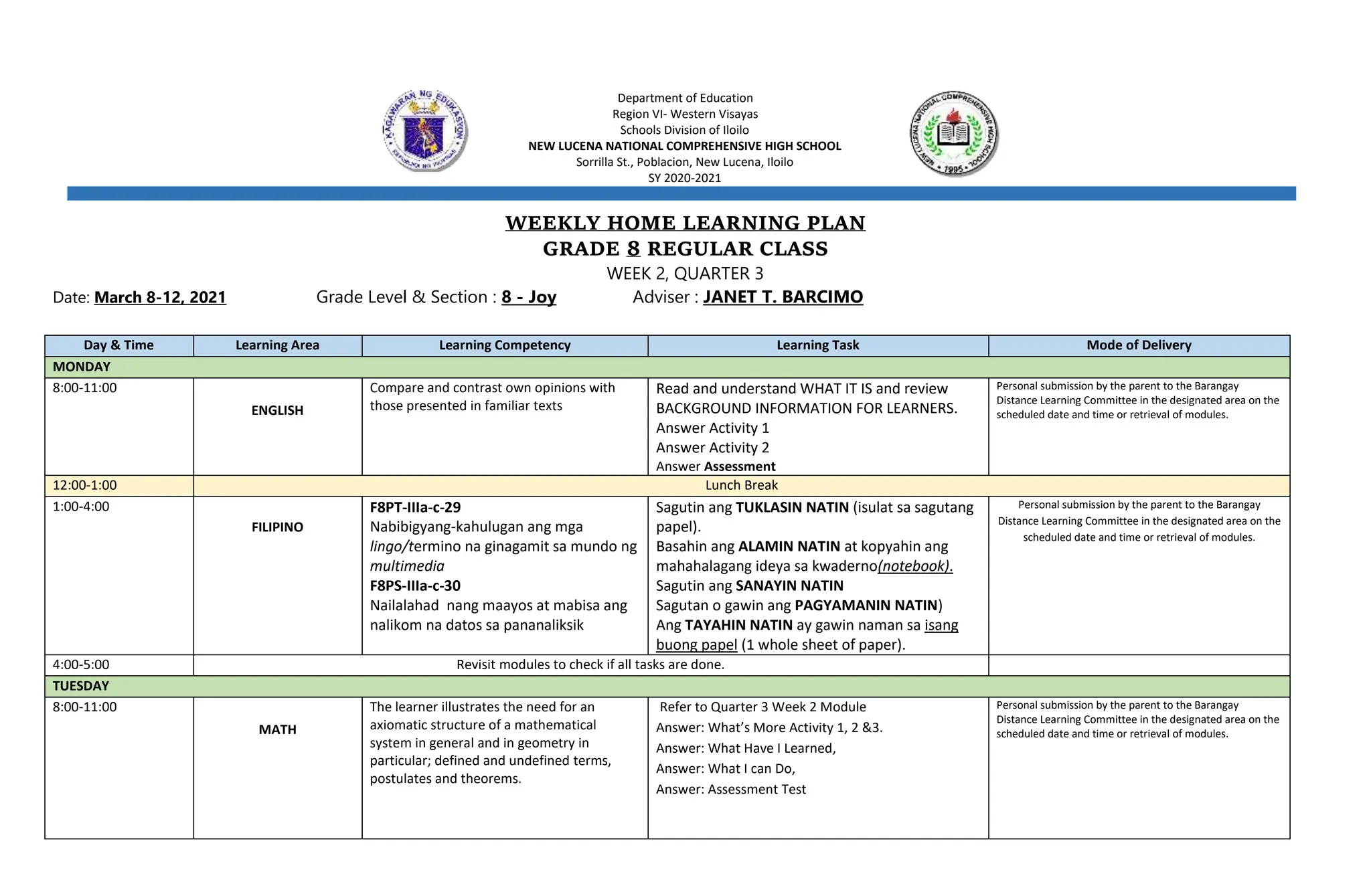 This document outlines the weekly home learning plan for Grade 8 students of the New Lucena National Comprehensive High School. The plan schedules learning areas and assignments for each day of the week from Monday to Friday. Students will complete tasks in their modules for subjects like English, Filipino, Math, Science, Araling Panlipunan, Music, Arts and Physical Education. They will submit the modules to the Barangay Distance Learning Committee on scheduled dates and times or retrieve new modules. The adviser, Janet Barcimo, prepared the plan which was approved by the school principal, Jennifer Tejerese.