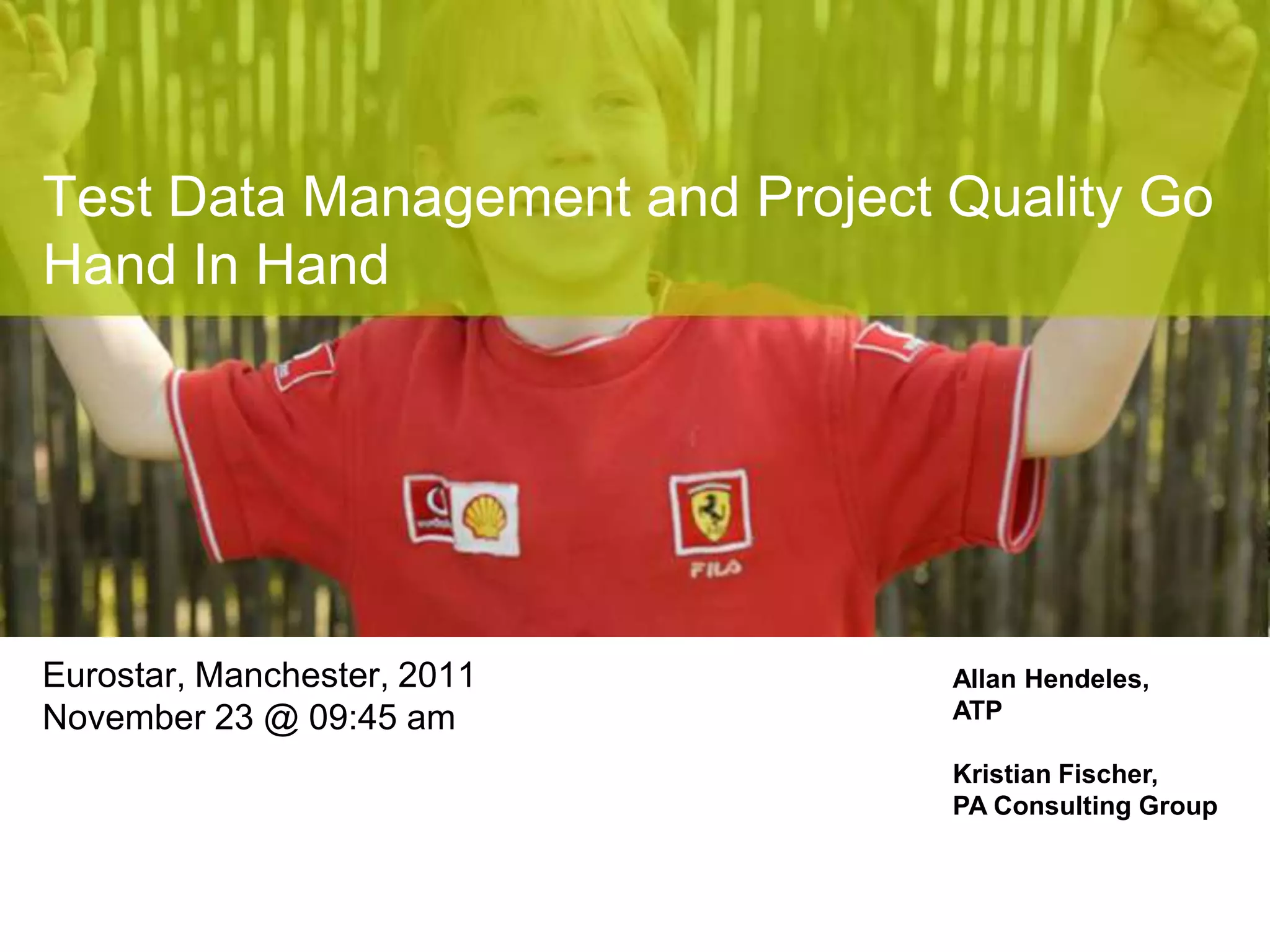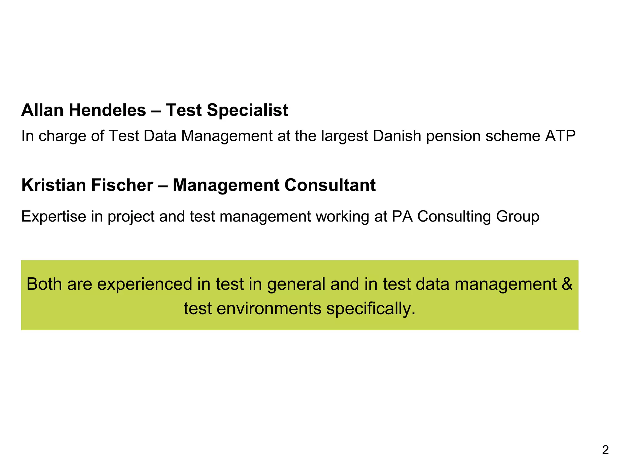 Allan Hendeles and Kristian Fischer present insights on test data management (TDM) and its crucial role in ensuring project quality, drawn from their experiences at ATP and PA Consulting Group. They emphasize the importance of stakeholder management, communication strategies, and security measures in implementing a successful TDM function. The presentation includes guidelines and best practices for managing test data in complex environments to improve testing processes and project outcomes.