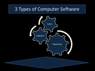 This document discusses different types of computer software. It explains that software acts as a translator between humans and computers, which use binary language. There are two main types of software: system software like operating systems and device drivers that allow hardware to function, and application software for specific tasks like word processors. Programming software provides tools for writing code, such as compilers that translate source code into executable programs, and text editors for modifying files.