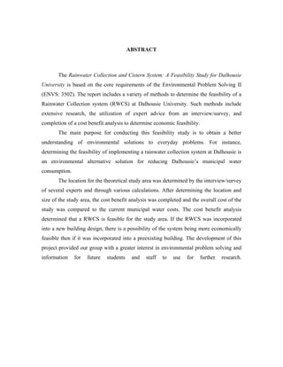 This document presents a feasibility study for a rainwater collection system at Dalhousie University. It was prepared by a group of 6 students for Dalhousie University. The study examines Dalhousie's current water usage and costs, then determines if a rainwater collection system could reduce costs and municipal water usage. Methods used include interviews with experts, research on rainwater collection systems, and a cost-benefit analysis comparing costs of the system to current water costs. The analysis determined a rainwater collection system was feasible and could save costs if incorporated into new building designs. The study provides information for future research on implementing such a system.