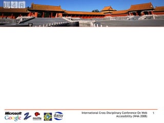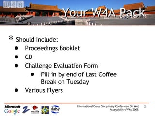 This document provides information about the W4A 2008 5th International Cross-Disciplinary Conference on Web Accessibility that was held on April 21-22, 2008 in Beijing, China. It includes details about the program materials, sponsorships, awards, keynote speakers, themes, submissions process, and plans for the next year's conference.