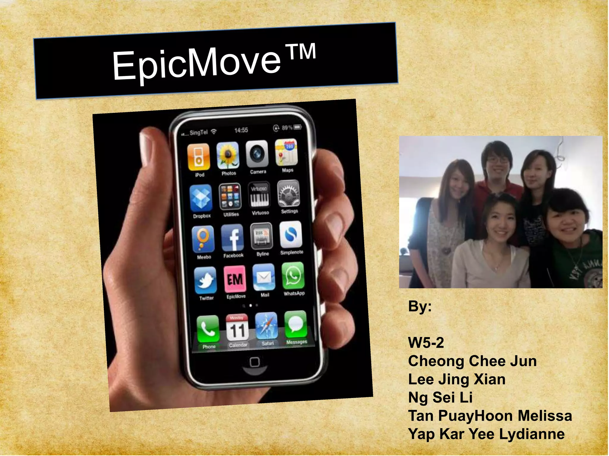EpicMove is a social networking and mapping mobile application designed to help female youths between 13-18 years old find suitable exercise buddies or group physical activities. The application aims to address the key reason female youths lack motivation to exercise regularly, which is that they do not enjoy exercising alone. It allows users to find friends to exercise with, meet new people with similar interests, receive exercise tips based on location, and view nearby exercise facilities. The proposed solution is a mobile application that utilizes mobility, instant connectivity, and interactivity through features like notifications of friends' activities, health tips, viewing exercise facilities, and finding others with shared interests.