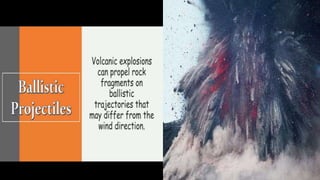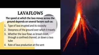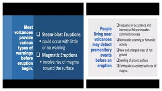 This document discusses volcanic hazards and provides learning objectives about identifying potential volcanic hazards, recognizing signs of impending eruptions, analyzing the effects of different hazards, interpreting hazard maps, and applying safety measures before, during, and after eruptions. It explores volcanoes in the Philippines and defines a volcano as an opening through which molten rock and gases erupt, often forming hills or mountains. The document aims to teach effective communication about volcanic hazards to keep families and communities informed and responsive.