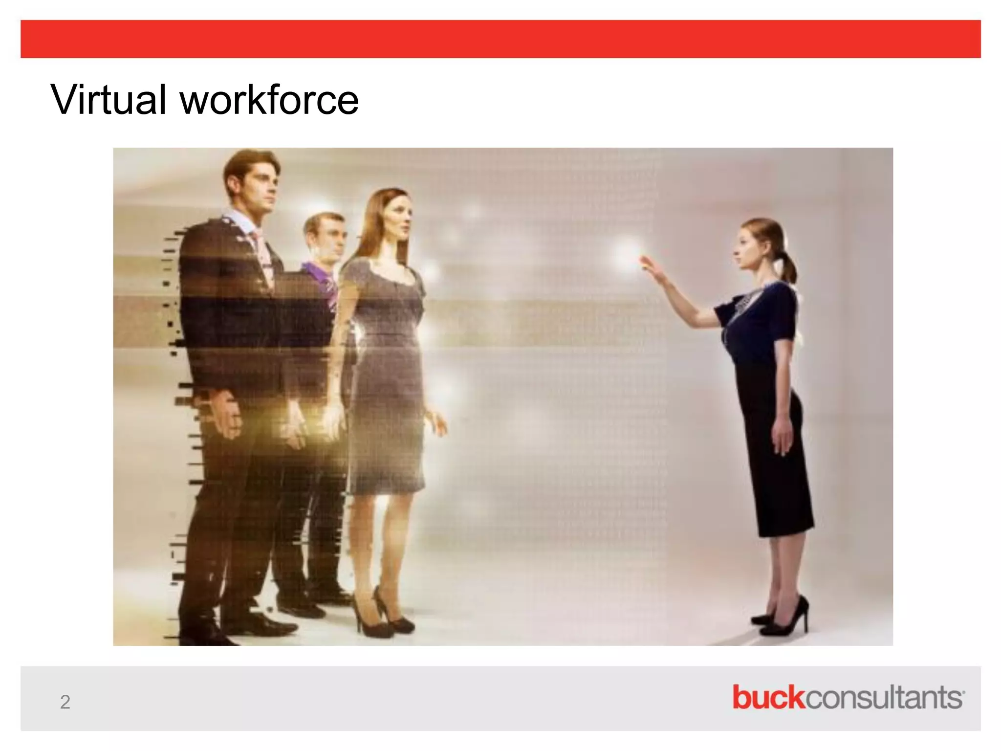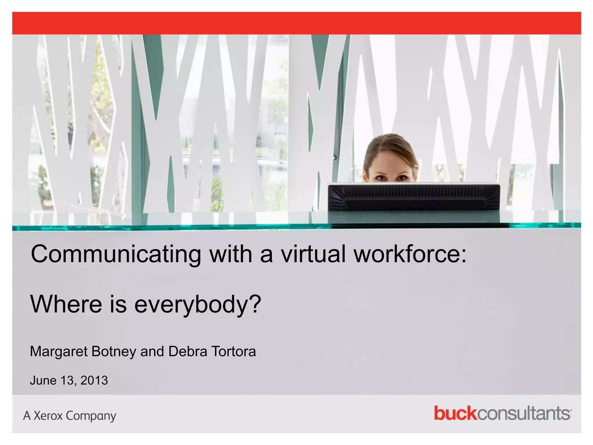 This document discusses communicating with virtual workforces. It defines virtual workforces as telecommuters or employees not located near senior management. Traditional communication tools are ineffective for virtual teams. Emerging technologies like gamification, mobile apps, and social networking can be 63% to 50% effective if used properly. Building virtual culture and connections are key. Challenges include lack of culture/buy-in and overwhelmed employees. Solutions involve selective messaging, varied tools through inclusive environments, and training managers and employees. A case study shows a company used an internal social media site and materials to increase health plan understanding from 38% to 62%.