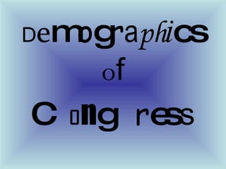 The document provides demographic information about members of the United States Congress, including gender breakdown, occupational backgrounds, and key leaders in both the Senate and House of Representatives. It also gives details about two representatives from Texas - Kay Bailey Hutchison and John Cornyn. Finally, it provides information about the current congressional session and upcoming matters for consideration in the Senate.