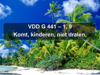 1Komt, kinderen, nietdralen,want de avond is nabij!Wij zouden licht verdwalenin deze woestenij.Komt, vatten wij dan moednaar de eeuwigheid te streven,van kracht tot kracht te leven.in 't eind is alles goed.