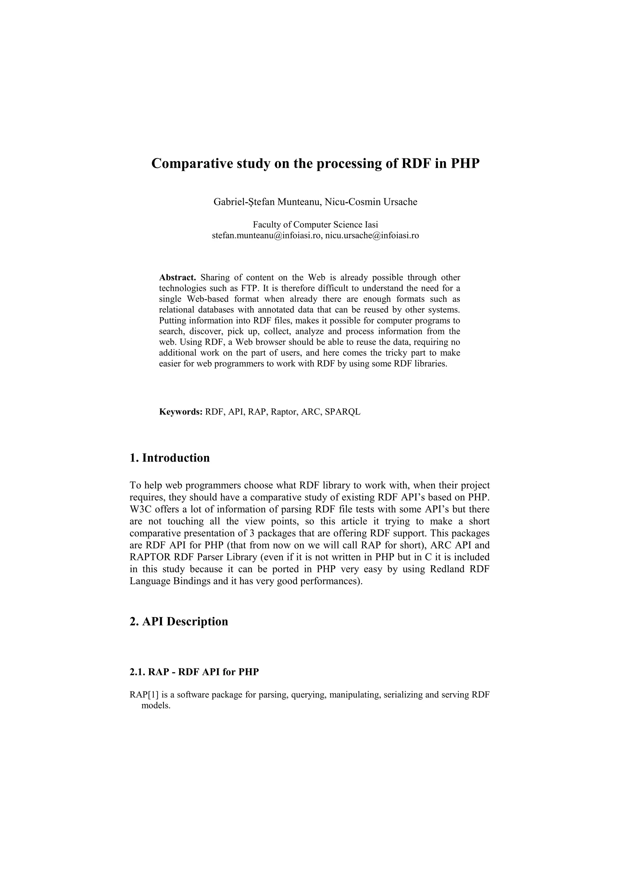 RAP, ARC, and Raptor are PHP libraries for processing RDF. RAP provides classes for manipulating RDF models and triples. ARC uses associative arrays to represent triples and resources, providing faster performance. Raptor is a C library with PHP bindings that parses RDF files into models. It had the highest performance on tests, passing all tests, while RAP and ARC passed most but not all tests.