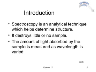 This chapter discusses infrared spectroscopy and mass spectrometry techniques for determining organic molecule structures. Infrared spectroscopy measures bond vibrations to identify functional groups present in a molecule. Mass spectrometry fragments molecules and measures the masses of the resulting fragments to deduce structural information. Together these techniques provide complementary data for elucidating molecular structures without requiring large sample amounts or destruction of the sample.