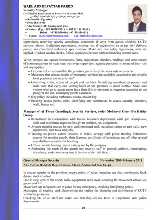 Wael Abd Elfatah Fared has over 26 years of experience in security management. He has worked as a security manager for hotels and companies in Egypt and the UAE. He is certified by the Department of Protective Systems in Dubai. His experience includes managing security operations and personnel for various facilities, conducting security surveys, and ensuring compliance with regulations. He has a bachelor's degree in military sciences and business administration.