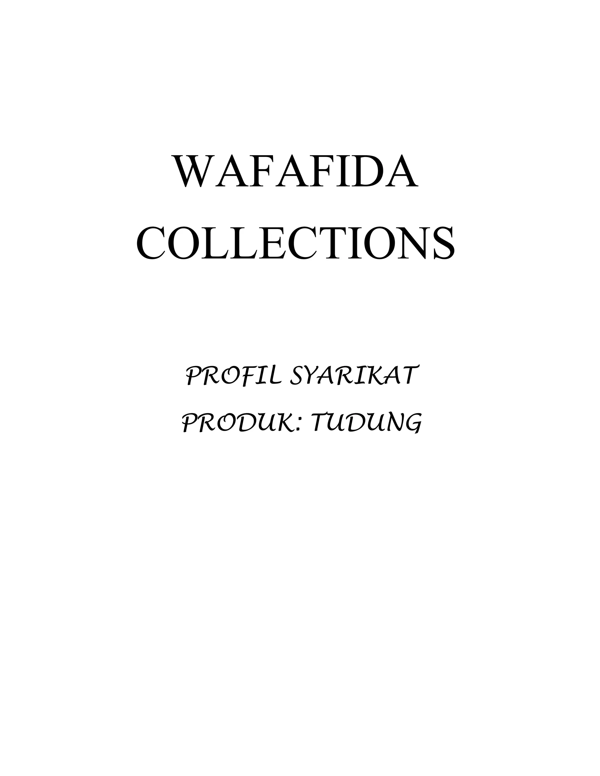 Wafafida Collections, ditubuhkan pada tahun 2010, adalah syarikat yang mengkhusus dalam fesyen tudung untuk wanita dengan misi menawarkan produk berkualiti yang mampu dimiliki oleh semua lapisan masyarakat. Syarikat ini mempunyai organisasi pengurusan yang berpengalaman dan menggunakan pelbagai jenis fabrik dari pelbagai negara untuk menghasilkan tudung yang menarik dan selesa. Strategi pemasaran syarikat memberi tumpuan kepada memenuhi permintaan pasaran yang semakin meningkat untuk fesyen tudung terkini dengan harga yang berpatutan.
