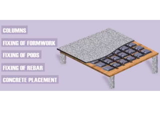 A grid slab or waffle slab is a reinforced concrete floor system with a waffle-like pattern of ribs. The ribs form a grid that runs in two directions, giving the underside a waffle-like appearance. This allows the slab thickness to be minimized while maintaining strength. Waffle slabs provide good load distribution, vibration control, and structural stability, making them suitable for use in airports, hospitals, and other large structures.