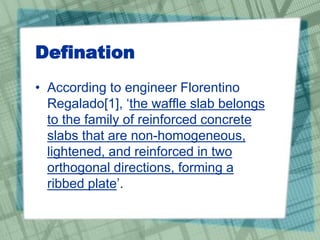 Waffle slabs are reinforced concrete slabs reinforced in two orthogonal directions, forming a ribbed plate. They are characterized by their total edge height, lightening block height, rib spacing, rib thickness, and compression layer thickness. Waffle slabs can adequately support distributed and point loads in two directions. Benefits include flexibility, light weight allowing longer spans, fast construction, slim depths, robustness, vibration control, thermal mass, and durability. Waffle slabs are constructed with ribs forming a grid pattern and solid fills at supports. Larger spans may use post-tensioning or joist construction. Proper design considers loads, materials, deformations, and tile installation compatibility.