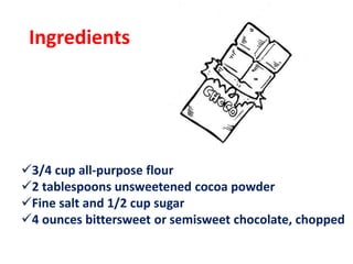 The document provides a recipe for making a waffled brownie sundae dessert, detailing the ingredients and steps involved. Key ingredients include flour, cocoa powder, sugar, chocolate, eggs, and toppings like ice cream and whipped cream. The document also mentions that the waffles can be frozen for up to a month.