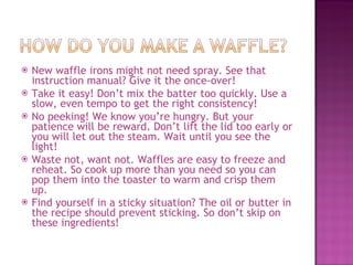 The document discusses the history and preparation of waffles. It notes that the first waffles were made in the 1200s using two cooking plates. Modern waffles are made from a batter of ingredients like milk, eggs, and salt and can have various toppings added after cooking. A waffle iron is used to cook the batter into its distinctive crispy and creased form using two heated plates that compress the batter.