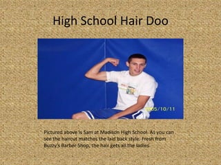 The document is a collection of photos showing different hairstyles of Sam Wagg over the years from high school to present day. It includes hairstyles like a tight fade he wore in college for track, a buzzcut he had after college, and his current style he gets from Supercuts. The hairstyles are said to match his personality and help him succeed with women over the years.