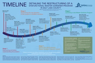 The document outlines the timeline of events in restructuring a dysfunctional Master Gardener program in Salt Lake County from March 2011 to November 2012. Key events included the agent shadowing another program, developing new policies and procedures, announcing changes to members, hosting orientations and classes for new Master Gardeners, and graduating the first class under the new program in November 2012.