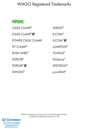 This document contains contact information for Electromate, including their toll free phone and fax numbers, website, and sales email. It also contains repeated sections advertising WAGO's I/O systems, modules, software, and accessories. Electromate is listed as the company that sells and services WAGO products. The document provides an overview of WAGO's modular I/O systems and components.