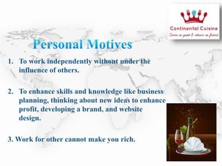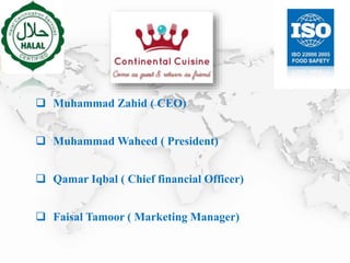 This document provides information about a proposed new restaurant called Continental Cuisine. It will be located in Islamabad, Pakistan and offer multinational foods from China, America, Italy, and Pakistan. There will be four partners who will hold top positions in the company. The restaurant aims to target educated professionals in Islamabad making over Rs. 150,000 with high quality international foods priced from Rs. 650 to Rs. 5000. It provides details on the investment, staffing, equipment, competitors, marketing plan, and steps to legally register the new company in Pakistan.