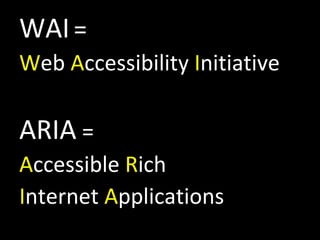 This document discusses WAI-ARIA and its role in improving web accessibility. WAI-ARIA (Accessible Rich Internet Applications) is a W3C specification that allows adding role, state and other metadata to web content to make dynamic content and interactive elements more accessible to assistive technologies like screen readers. It serves as an important "bolt on" approach to accessibility, allowing web languages like HTML and SVG to be more accessible even as they evolve beyond their original use cases.