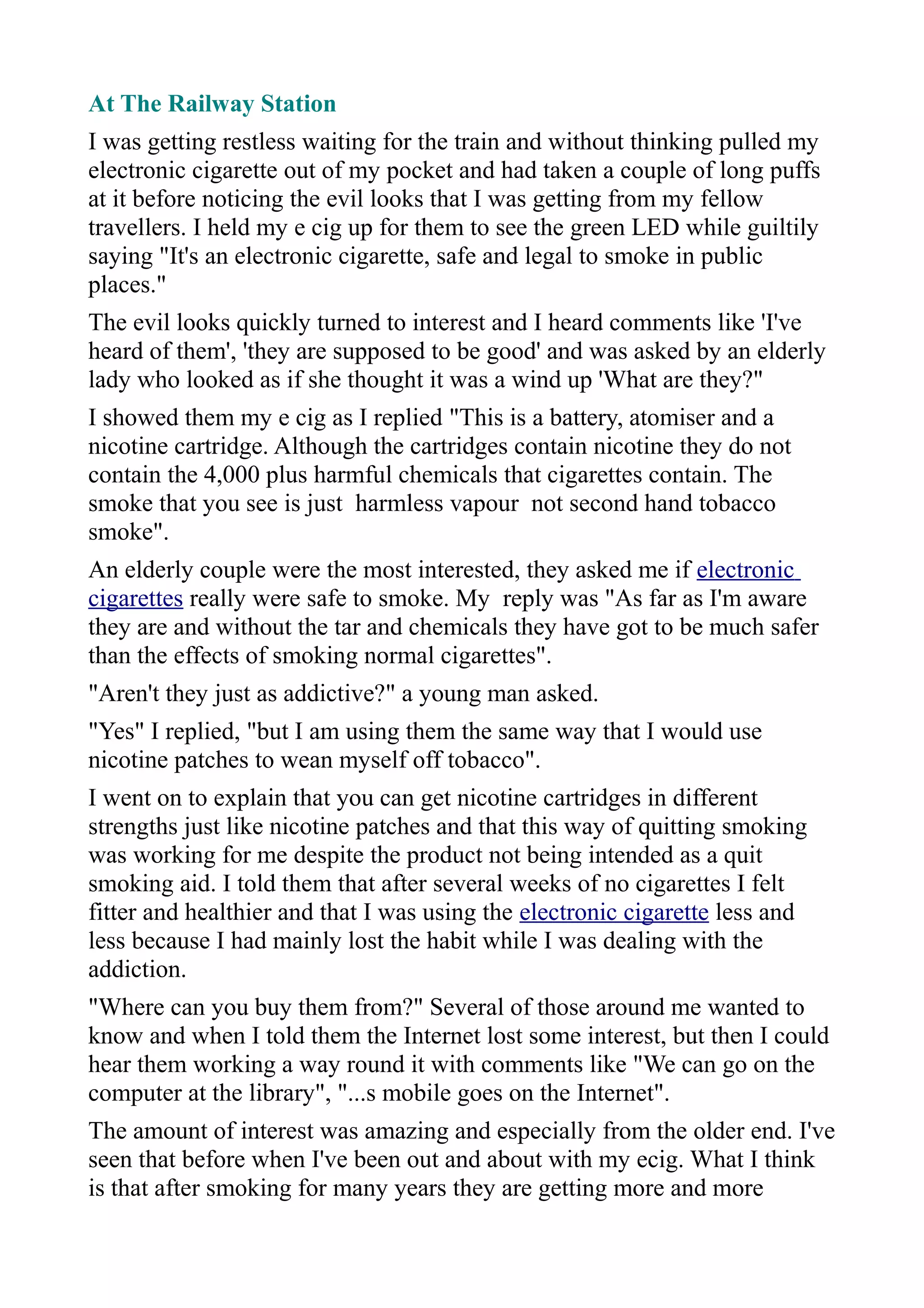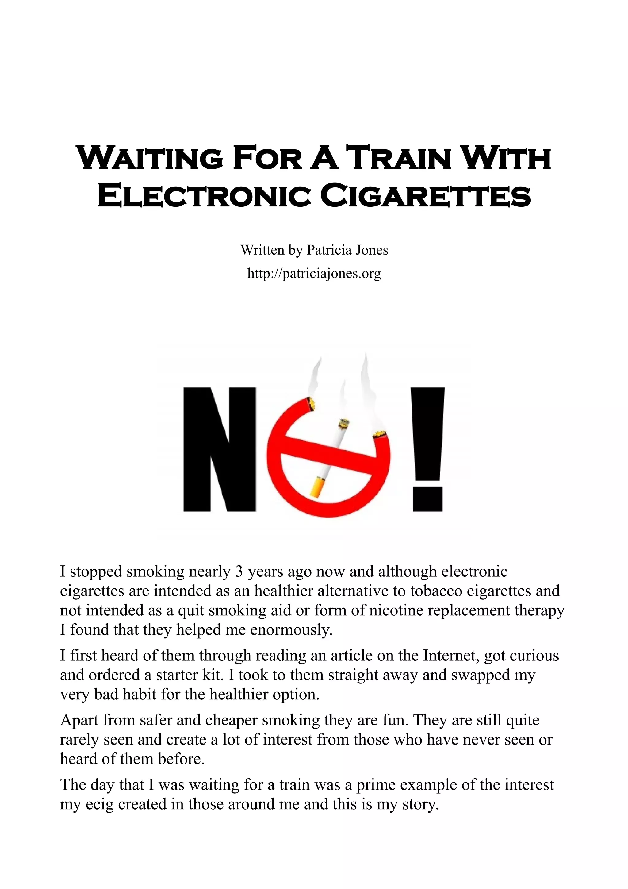 Patricia Jones shares her experience of switching from traditional cigarettes to electronic cigarettes nearly three years ago, noting their appeal as a safer and fun alternative. While waiting for a train, she encounters curiosity from fellow travelers who inquire about e-cigs, leading her to explain their benefits and how they can assist in reducing tobacco use. Despite some interest, questions about pricing and their effectiveness as a quitting aid arise, highlighting the broader public's growing fascination with e-cigarettes as a potential solution to smoking-related health issues.
