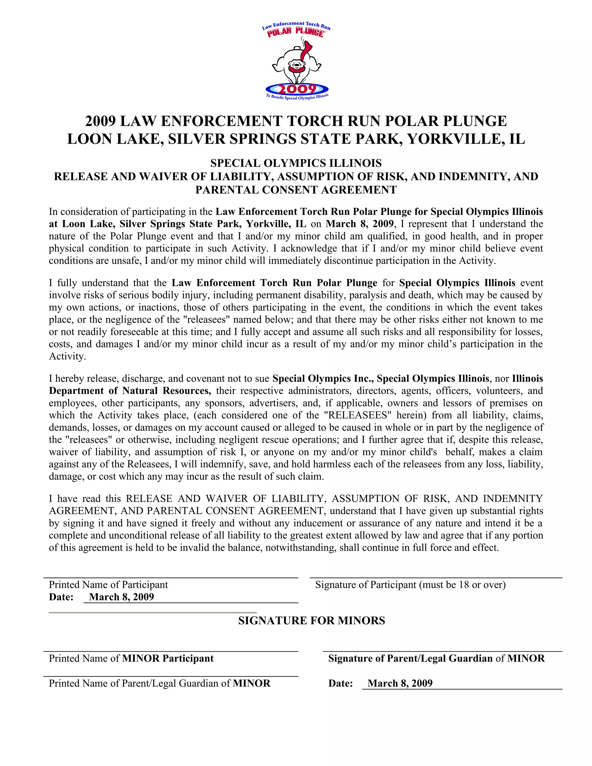 This document is a release and waiver of liability for participants in the 2009 Law Enforcement Torch Run Polar Plunge event in Yorkville, Illinois on March 8, 2009. It acknowledges the risks of injury or death from the polar plunge activity and releases Special Olympics Illinois and other organizations from liability. Participants or their guardians sign to accept the risks and not hold the organizers legally responsible for any injuries or claims resulting from the event.