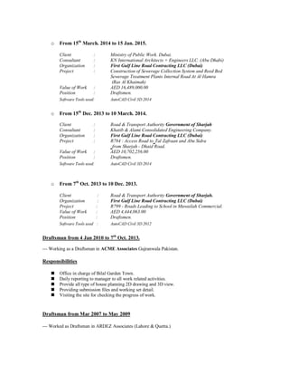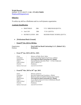 Wajid Hussain is a draftsman from Pakistan seeking a position utilizing his skills. He has over 10 years of experience as a draftsman in the UAE and Pakistan. He provides 2D and 3D drawings using software like AutoCAD. His resume lists his educational qualifications and details of his professional experience on various infrastructure projects in the UAE and Pakistan as a draftsman. He is proficient in software like AutoCAD, MS Office, and has good communication skills in English, Urdu and Punjabi.