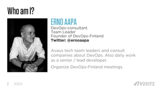 This document discusses DevOps from the perspective of Erno Aapa, a DevOps consultant. It outlines some common misunderstandings about DevOps, such as thinking it is a role or team. The document then discusses the history of approaches like Agile, Scrum, and Continuous Integration that influenced DevOps. It explains how DevOps gives companies the capability to experiment and deploy changes rapidly and safely. The benefits of DevOps include faster deployments, improved collaboration between Dev and Ops teams, and the ability to get feedback from customers to continuously improve.