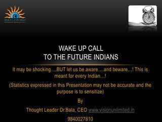 This document summarizes several concerning statistics about issues facing Indians such as low breastfeeding rates, gaps in education, lack of skills training, high suicide rates, preventable blindness, alcohol and tobacco use. It notes that 49% of Indian women are against breastfeeding, over 1 million Indians are blind but only 20,000 donate eyes annually, and smoking causes over 51 million deaths worldwide each year. The purpose is to raise awareness of problems Indians may face in the future if issues are not addressed.