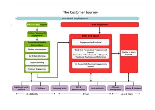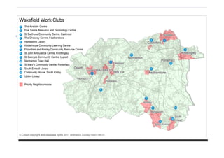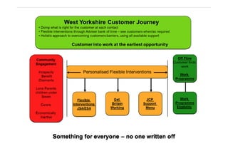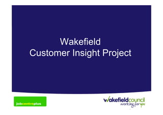 This document summarizes a customer insight project conducted by Wakefield Council and Job Centre Plus. Through stakeholder events, focus groups, interviews, and user groups, they gathered insights about unemployed customers. Key findings included the need for personalized support, help with skills and finances, and barriers like fragmented services, health issues, and lack of work experience. The document outlines reforms to better coordinate support through flexible interventions, work experience programs, sector-based work academies, and enterprise clubs. It also discusses implementing the Work Programme to help more customers find jobs.