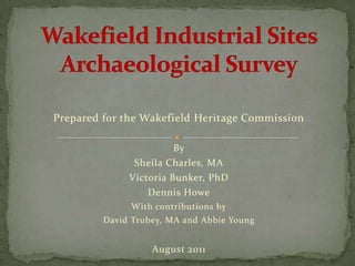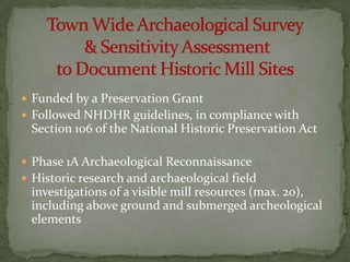 The document summarizes an archaeological survey of historic mill sites in Wakefield, New Hampshire. It identifies 20 mill locations that were investigated through historic research and field work. Key findings included ruins of dams and mill foundations at sites along the Pine River, Lovell Lake, Branch River, Great East Lake, and Horn Pond. The survey identified mills ranging from the early 1800s to the late 1800s, some operated by families and others by larger companies. The archaeological work helped uncover new details about Wakefield's industrial past.