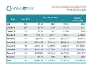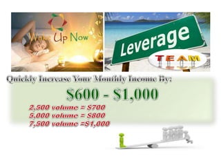 The document outlines a business opportunity with WakeUpNow, which allows individuals to earn money by saving on everyday expenses and receiving commissions for referrals. It highlights various bonuses and income potential based on recruiting others and reaching specific customer volume thresholds. The offering includes additional services such as discounts on phone plans, financial management tools, and access to exclusive products and services.