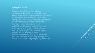 The poem describes a father waking up to see his young son smiling at him. The father is struck by the son's smile and returns it, feeling as though he has rediscovered his own smile or found a new path in life. The exchange of smiles between father and son connects them and pours through them like a river. The father is grateful for this moment of waking among men and kisses his son, pledging to cherish their relationship forever.