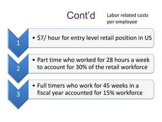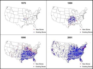 The document discusses the history and operations of Walmart, beginning with the origins of discount retailing in the US in the 1950s. It notes Walmart and Kmart's founding in the 1960s and their growth through innovations in the 1980s and 1990s with larger supercenter formats. The summary provides details on Walmart's operations as of 2003, including over 4,600 stores across the US, supply chain and distribution networks, merchandising and pricing strategies, and management practices emphasizing responsibility, control, commitment and strategic analysis that contributed to its success.