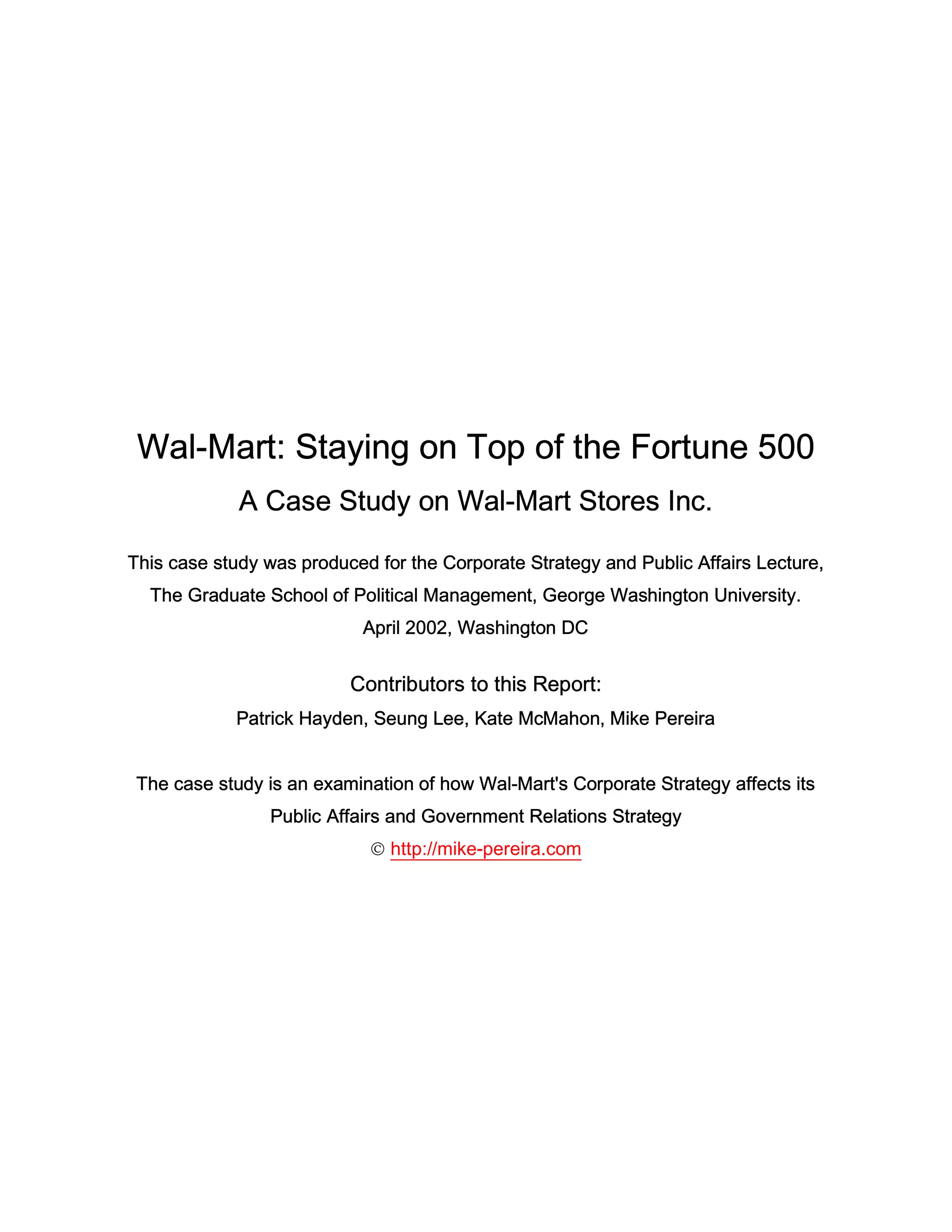 This document provides background information on Wal-Mart and analyzes its corporate strategy. It discusses how Wal-Mart has become the largest retailer in the US and number one on the Fortune 500 by focusing on low prices, supply chain management, and expanding into new markets both domestic and international. The document also examines Wal-Mart's public affairs strategy and how it works to support the company's policy goals and continued growth.