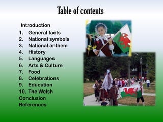 This document provides an overview of Wales, one of the countries that make up the United Kingdom. It discusses Wales' national symbols, anthem, history, languages, arts and culture, food, celebrations, education system, and Welsh people. The purpose is to give a general introduction to Welsh culture and facts so readers can learn more about this English-speaking country. It emphasizes that Wales has its own distinct identity and traditions, including the Welsh language, which is one of the oldest in Europe and still spoken today.