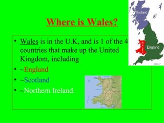 Wales is one of the four countries that make up the United Kingdom. It is famous for its beautiful countryside, nice beaches, and good singers. The capital of Wales is Cardiff. Welsh is the country's native language and St. David's Day is celebrated annually on March 1st. Famous Welsh singers include Tom Jones, Catatonia, and Bonnie Tyler. Swansea is located in south Wales and is known for its beaches and nightlife. Rugby and football are popular sports in Wales, and Swansea City has connections to Spanish footballers and managers.
