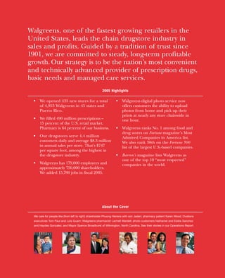 This document is Walgreens' 2005 annual report which summarizes the company's financial performance and highlights of the year. It discusses how Hurricane Katrina impacted their business in Louisiana and Mississippi, forcing the closure of 74 stores initially and resulting in a $54.7 million pre-tax charge. It also describes how Walgreens stepped up to serve as an emergency healthcare provider in the affected areas and used its pharmacy systems and other stores to continue filling prescriptions for evacuated customers. The report emphasizes that Walgreens' consistent success is due to the talent and determination of its employees, allowing it to achieve record sales and earnings for the 31st consecutive year despite the hurricane challenges.