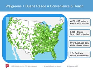 The document promotes Walgreens' API program which allows developers to integrate their apps with Walgreens' 8,000+ stores and services. The API provides access to prescription refills and transfers, printing services to stores, and opportunities to increase customer engagement like photo cards. Developers are encouraged to use the API by signing up on the developer portal to gain an API key and onboarding assistance.