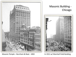The document discusses historic preservation challenges in rehabilitating several notable Chicago buildings from the late 19th/early 20th century, including the Monadnock Building and Masonic Temple. It also provides examples of approaches to preserving historic interior spaces and mechanical systems. Additionally, it summarizes the history of the Denver Dry building, including its original construction and later alterations and expansive 1990s rehabilitation project into a mixed-use development.
