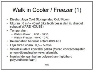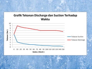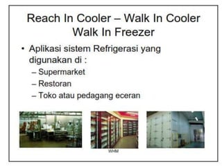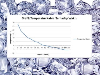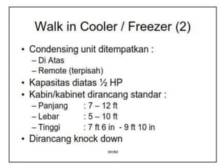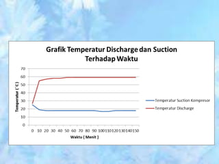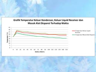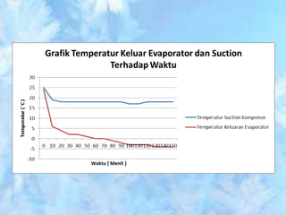 Dokumen ini membahas tentang sistem walk-in freezer dan pengujian sistem refrigerasi yang mencakup pengukuran suhu dan tekanan pada berbagai titik selama proses pendinginan produk pisang. Hasil pengamatan menunjukkan perubahan suhu dari kabin dan produk, serta analisis efisiensi dan performa sistem, termasuk COP aktual dan rasio kompresi. Kesimpulan menekankan pentingnya komponen seperti heat exchanger dan pengaruh rasio kompresi terhadap kapasitas pendinginan.