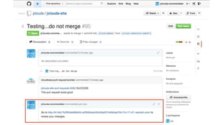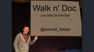 The document discusses the challenges of traditional documentation and proposes using Walk n' Doc and jclouds to create documentation that is beautiful, up-to-date, discoverable, and easy to change. Walk n' Doc uses GitHub, Markdown/HTML formats, and a web browser along with easy reviews to improve upon documentation. jclouds in particular utilizes Jekyll, Jenkins, and cloud files to redesign its site through an open process with many participants, comments, and builds. The overall message is that Walk n' Doc and jclouds can establish a culture of contribution and improve documentation beyond just documentation.