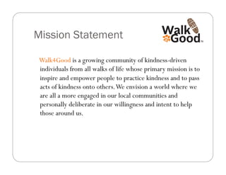 Walk4Good is a community initiative aimed at inspiring kindness and empowering individuals to engage in acts of kindness within their communities. The program features a 2,180-mile walk by Christine and her dog Jessie along the Appalachian Trail, with dedications made for each mile towards promoting kindness. The initiative highlights the importance of creating a culture of kindness and encourages individuals to pay it forward through small or large acts of compassion.