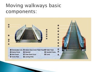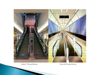 Moving walkways, also known as travelators or moving sidewalks, are conveyor mechanisms that transport people horizontally or at a slight incline over short to medium distances. They are commonly used in airports, train stations, museums, zoos, theme parks, and public transport systems to help people move efficiently from one point to another. Moving walkways operate similarly to escalators but can run horizontally and at shallower inclines up to 15 degrees. They consist of a flat moving surface made of interlocking metal plates or a rubber belt that rides on a series of rollers powered by an electric motor.