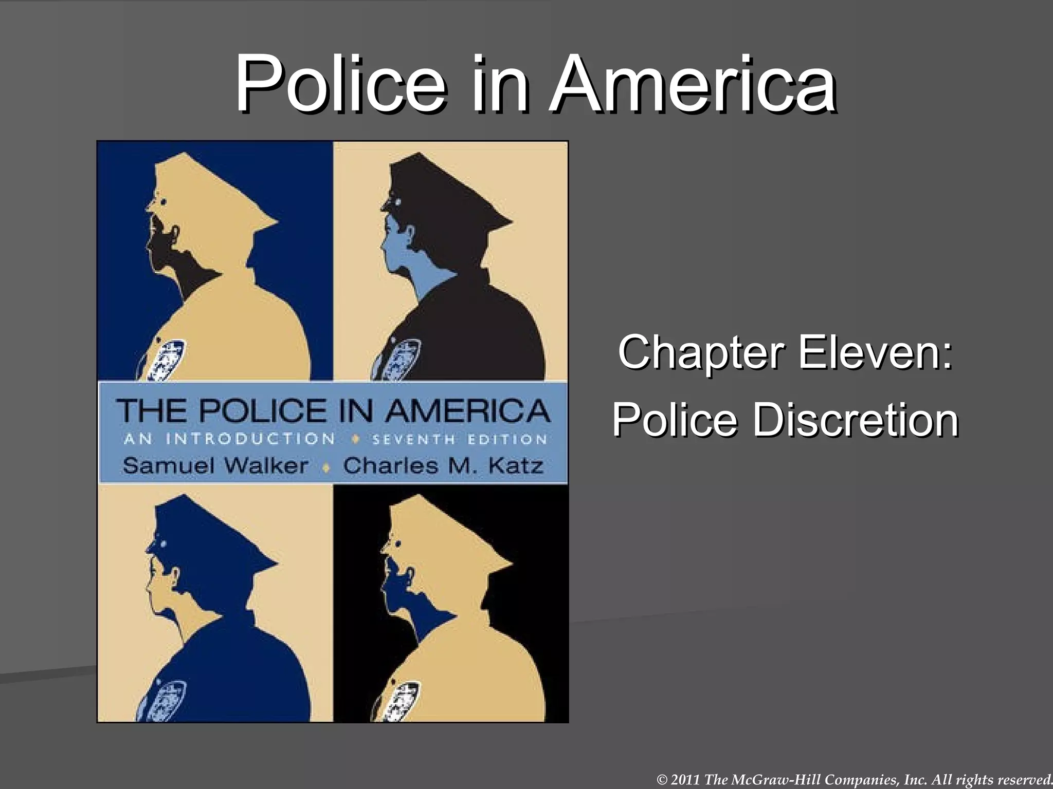 Police have significant discretion in carrying out their duties. This discretion involves critical decisions such as making arrests, referring juveniles to court, and using deadly force. While discretion allows police to consider unique aspects of each situation, it can also lead to abuse and inconsistency if not properly controlled. Written policies and oversight seek to structure discretion to promote consistent and fair outcomes, improve public policy, and enhance professionalism in law enforcement. However, rules cannot cover all situations and may sometimes have unintended negative effects if not implemented carefully.